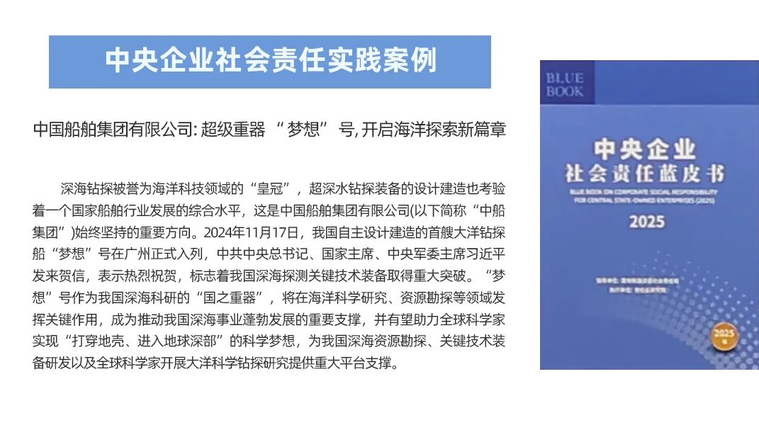 中船集團申報的《超級重器“夢想”號,開啟海洋探索新篇章》,聚焦國之重器建造歷程,闡述了“夢想”號在海洋科學研究、深海資源勘探等領域的關鍵作用,成功入選《中央企業社會責任藍皮書(2025)》中央企業社會責任實踐案例。