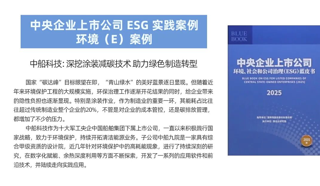 中船集團旗下上市公司中船科技申報的《深挖涂裝減碳技術 助力綠色制造轉型》,聚焦環保治理工作,以技術創新助力產業轉型,為行業綠色發展提供了實踐示范,成功入選《中央企業上市公司環境、社會和公司治理(ESG)藍皮書(2025)》環境(E)案例。