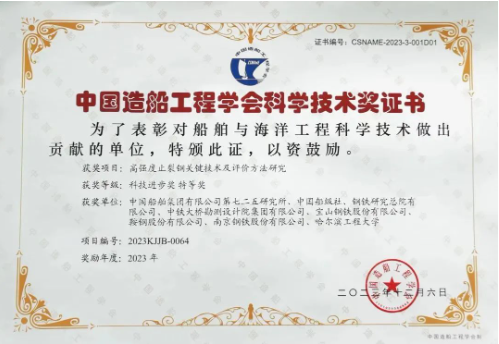 近日,中國造船工程學會發布了2023年科學技術獎評審結果,中國船舶集團七二五所申報的“高強度止裂鋼關鍵技術及評價方法研究”榮獲科技進步獎特等獎。項目團隊歷經十余年技術攻關,在國際上首次提出了止裂性能大尺寸雙重拉伸試驗方法和小尺寸替代試驗方法,并成功將其納入國際船級社協會(IACS)通用規范,極大提升了我國在該領域的國際話語權和技術影響力。