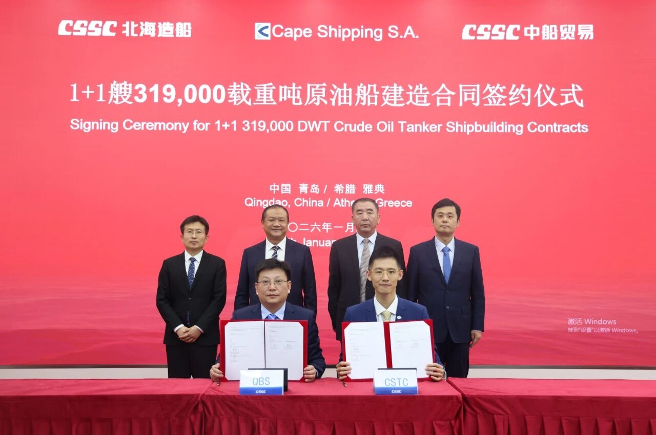 簽約儀式在青島與雅典同步舉行,標志著北海造船在綠色大型油船建造領域再次取得重要突破,充分體現了船東對北海造船品牌與油船建造質量的高度認可,也進一步鞏固和提升了中船集團在大型油船建造領域的市場份額與全球競爭力。