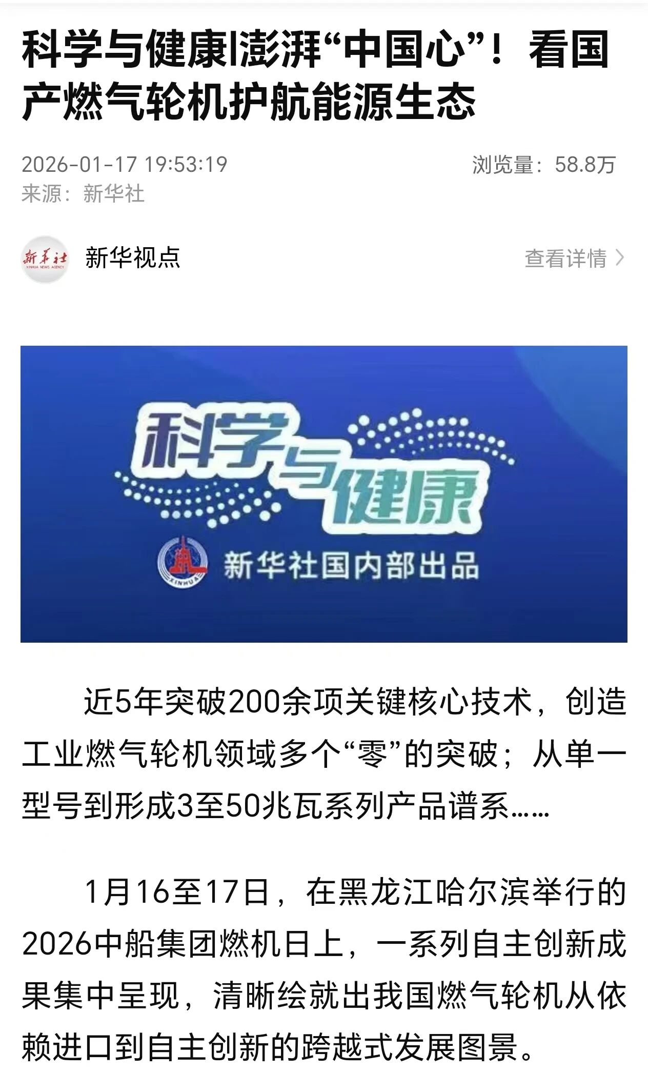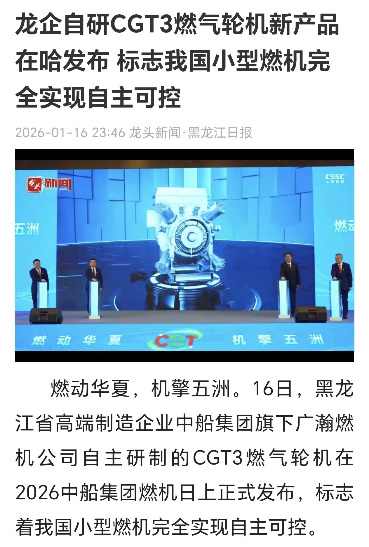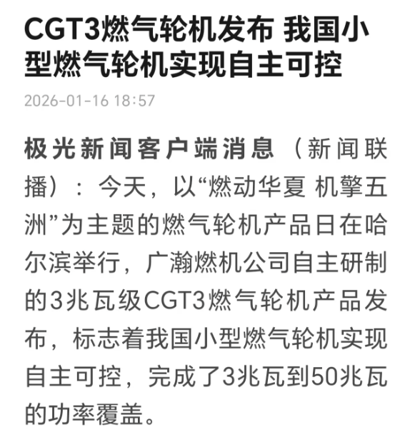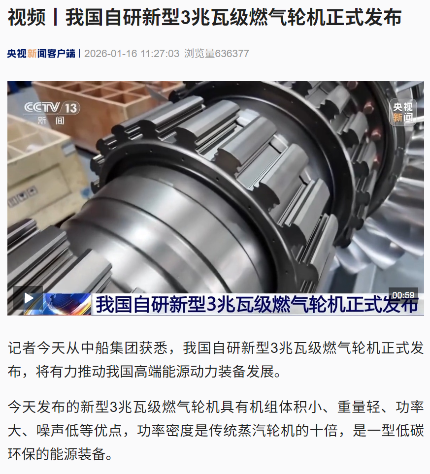 燃動華夏 機擎五洲。1月16日-17日,2026中船集團燃機日活動在黑龍江哈爾濱舉行,由中船集團七〇三所自主研制的CGT3燃氣輪機在活動期間重磅發布。CGT3燃氣輪機核心指標全面對標國際先進水平,其成功研制標志著我國在中小型燃氣輪機領域實現關鍵突破,活動引發新華社、央視、科技日報、黑龍江日報等多家中央及地方媒體關注報道。